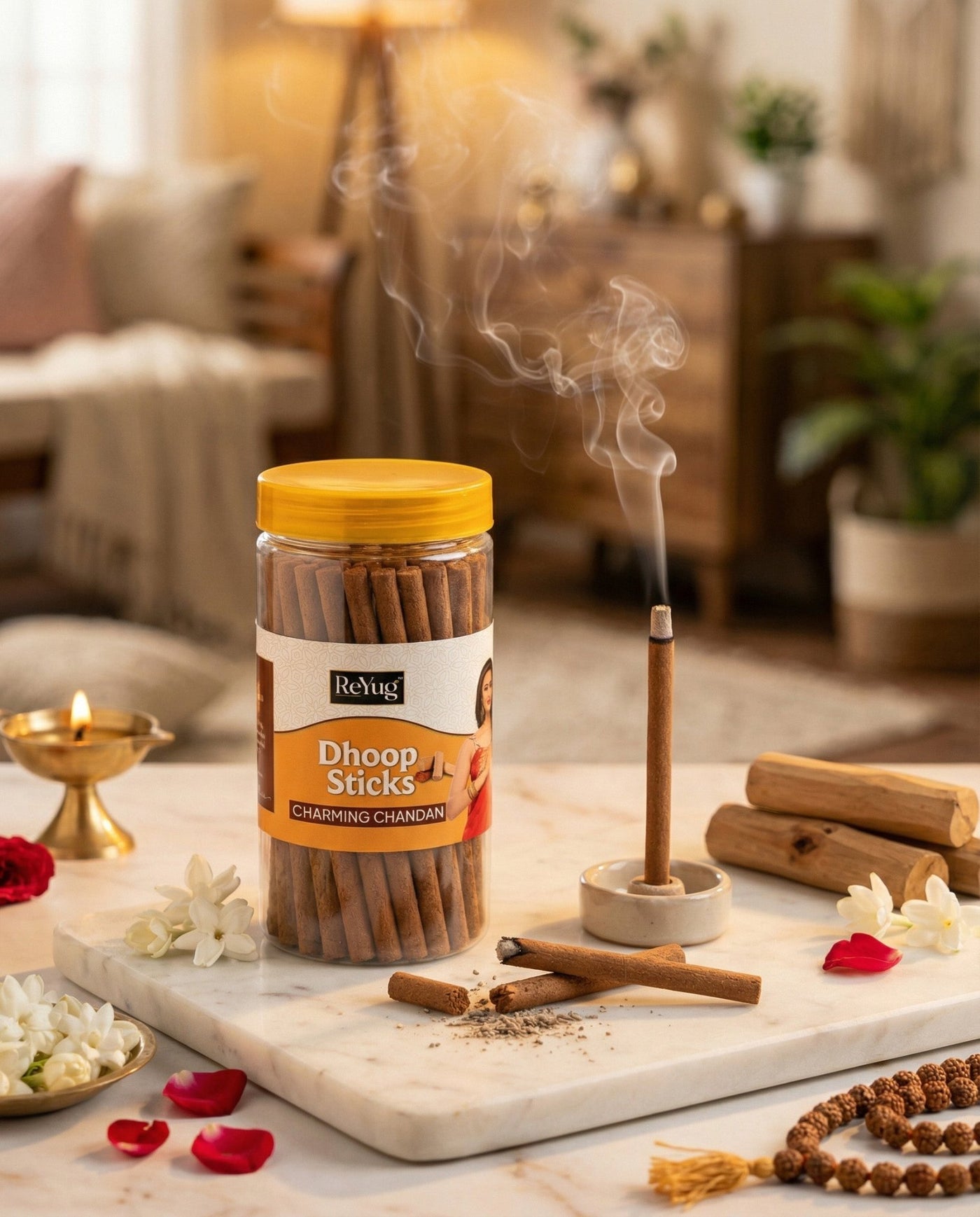Charming Chandan Classic Sandalwood fragrance relaxes the mind, uplifts mood, and spreads sacred calmness in spiritual rituals.